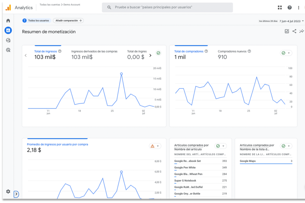 Dentro de los informes predeterminados de Google Analytics 4, es posible encontrar, a su vez, dos tipos de informes: los informes de tipo resumen, y los de tipo detalle.