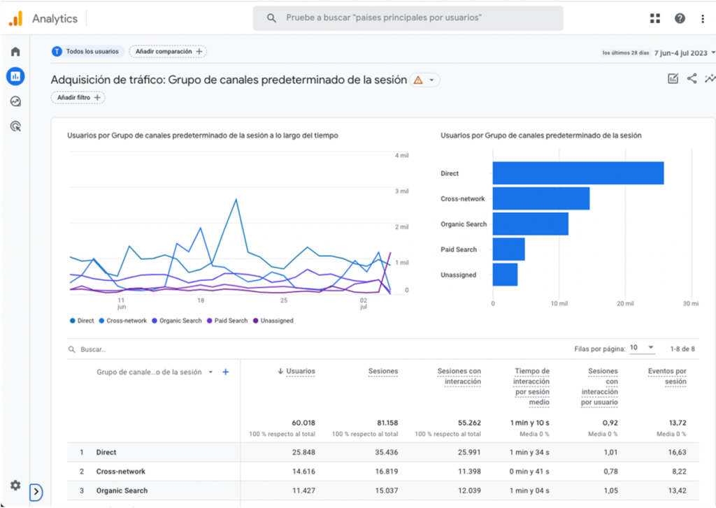 Google Analytics 4 es, por tanto, una herramienta de medición digital capaz de medir y recoger los datos de actividad de los usuarios, con independencia de si navegan a través de una página web o de una aplicación móvil.